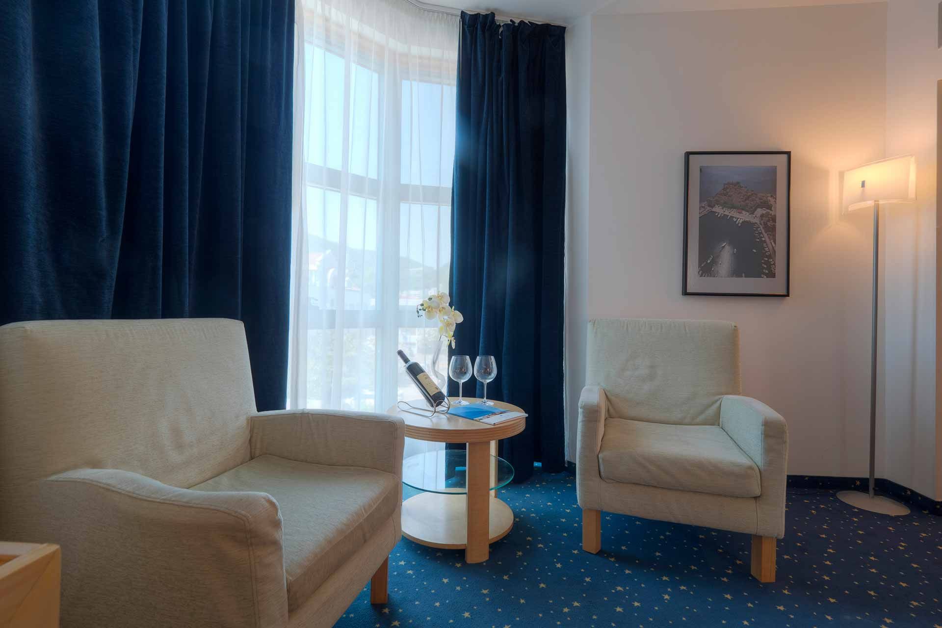 The smartly decorated rooms feature large beds and pleasant views of the city and Budva Bay